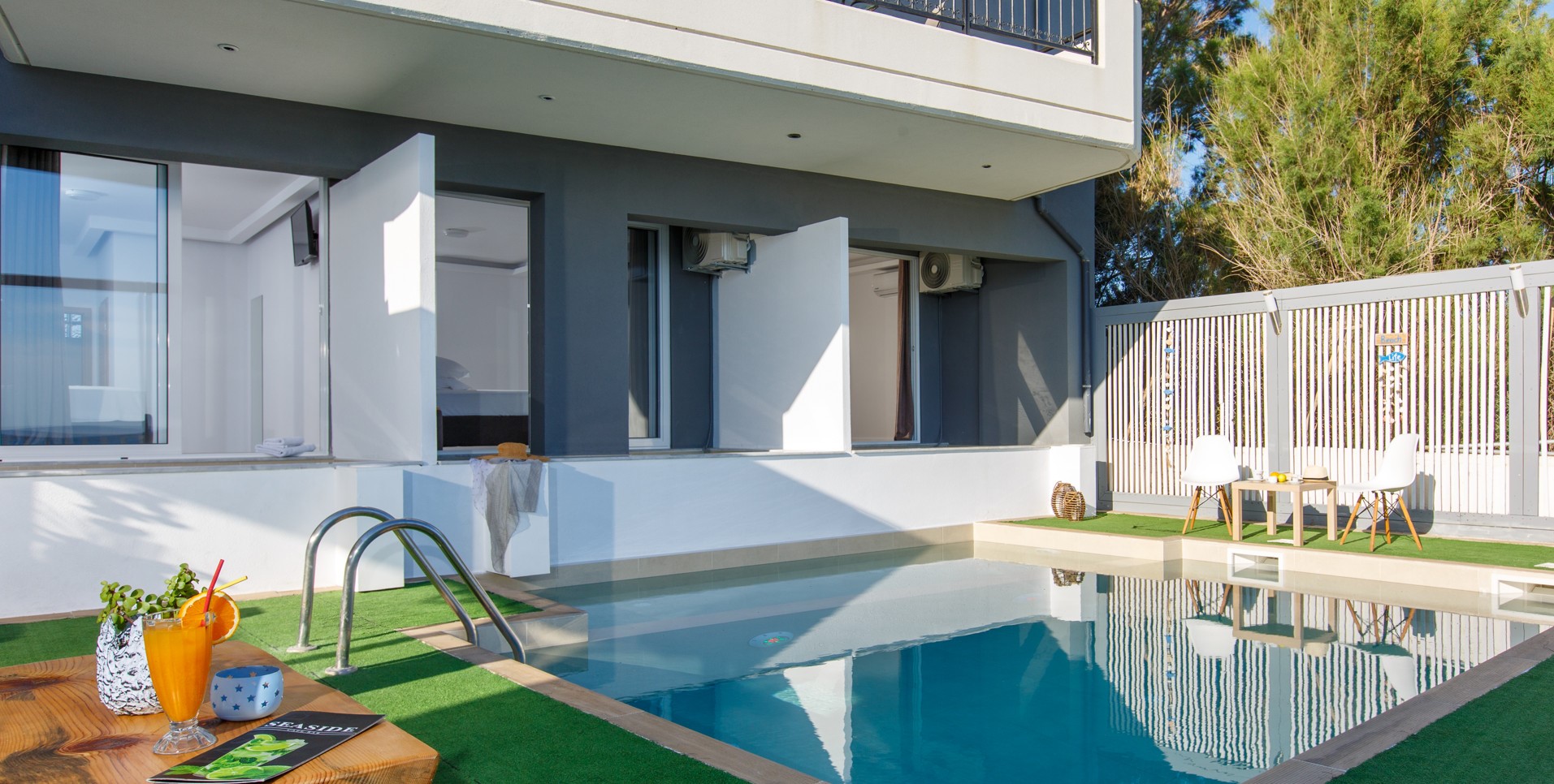 Rooms are arranged on the first and second floor. First floor rooms enjoy a private pool , while second floor rooms enjoy the amazing sea view at their balcony .