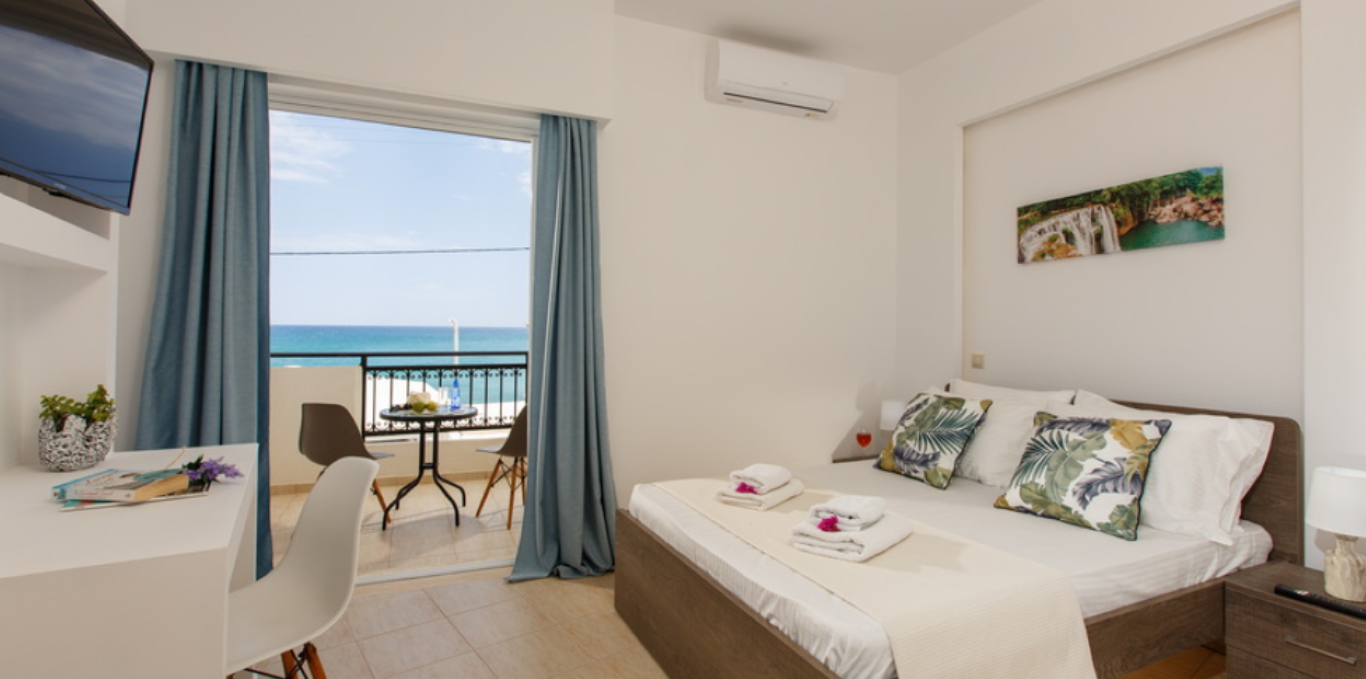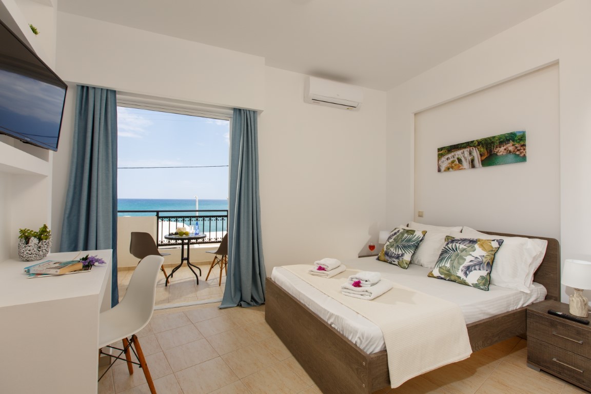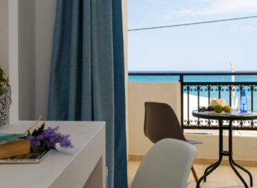 Large triple rooms are located on the first floor and have an awesome Aegean sea view, large windows and a lot of space inside. You are also able to upgrade your room to an upper floor. The rooms on the second floor come with a balcony and 2 comfortable chairs for your disposal.
